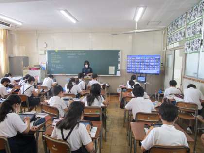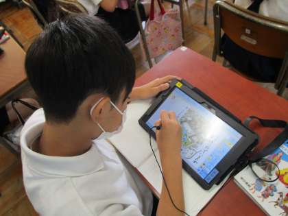 6年生の社会科の授業では、ICT支援員のサポートがあり、タブレットのデータに文字を入れるなどし、データを全体で共有しながら授業を行いました。6年生の子どもたちはさすがにタブレットの扱いも慣れています。