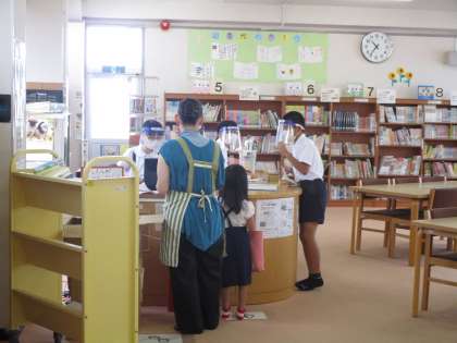 毎週水曜日は図書館補助員さんが来校されます。図書室におられますので、図書委員会の子どもたちと図書室を開放し、貸し出しなどを行っています。