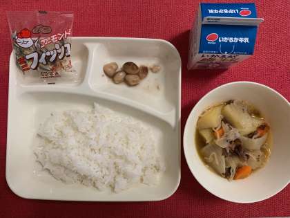 今日の献立は、『肉じゃが・とら豆の煮もの・アーモンドフィッシュ・米飯・牛乳』でした。