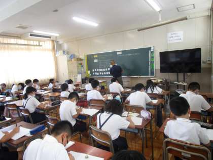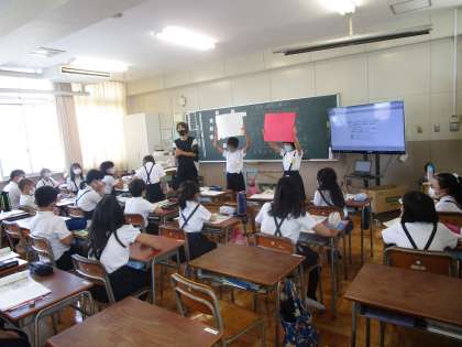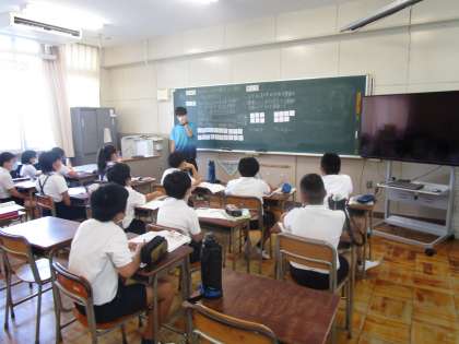 5年生は学年を3分割して算数の学習に取り組んでいます。偶数と奇数の性質について学習していました。まだ暑い日が続いていますが、子どもたちは集中して学習に取り組んでいます。