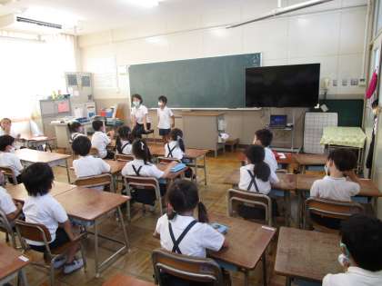 1年生は、教室で国語、中庭で図工科の活動に取り組んでいました。