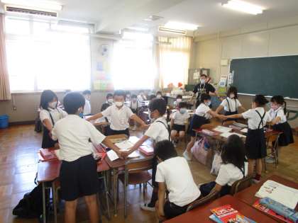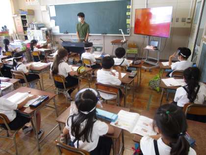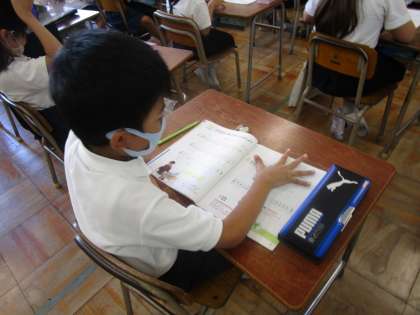 音楽科の学習では、鍵盤ハーモニカの指使いを学習していました。今は感染症予防のため、まだ鍵盤ハーモニカをふく学習は行っていません。鍵盤ハーモニカを使って学習できるときに備えて学習に取り組んでいます。
