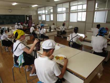 今日はスクランブルエッグと三色野菜炒めを作りました。2〜3人での実習なので分担して手際よく進めていました。さすが6年生です。喫食はみんな同じ方向を向いて食べます。