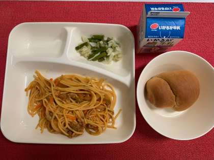 今日の献立は、『イタリアンスパゲッティ・グリーンアスパラガスとキャベツのサラダ・黒糖パン・牛乳』でした。