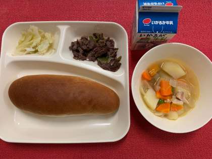 今日の献立は、『牛肉の香味焼き・スープ煮・サワーキャベツ・黒糖パン・牛乳』でした。