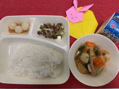 今日の献立は、月見の行事献立で『一口がんもとさといものみそ煮・牛肉と野菜のいためもの・みたらしだんご・米飯・牛乳』でした。