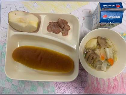 今日の献立は、『鶏肉のガーリック焼き・豚肉と野菜のスープ煮・りんご・パンプキンパン・牛乳』でした。