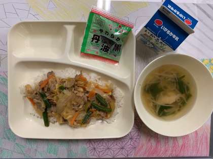 今日の献立は、『ピリ辛丼・中華スープ・ソフト黒豆・牛乳』でした。