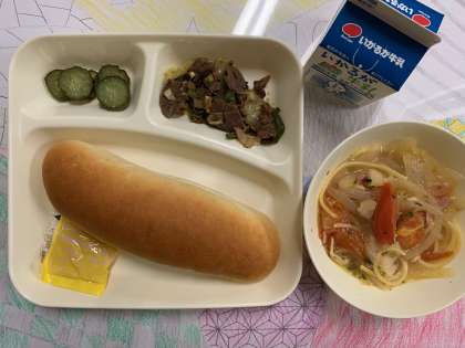 今日の献立は、『牛肉のカレー風味焼き・ほたて貝とトマトのスープスパゲッティ・きゅうりのサラダ・コッペパン・アプリコットジャム・牛乳』でした。