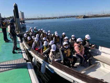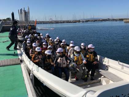 午後からはカッター体験です。9mカッター3艇に分かれて乗り込みます。大きな楷を持って船を進めます。
