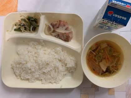 今日の献立は、『鶏肉のゆず塩焼き・ソーキ汁・もやしとさんどまめの甘酢あえ・米飯・牛乳』でした。