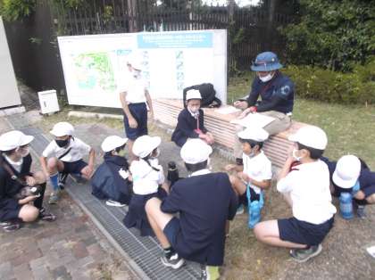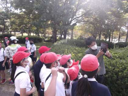 たてわり班で1年生から6年生が協力して公園内を回り、ゲームやクイズを楽しみました。