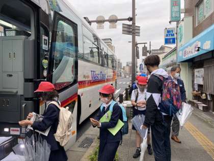 あいにくの曇り空ですが、子どもたちは元気いっぱい笑顔いっぱいでバスに乗り込みました。