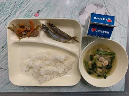 今日の献立は、『焼きししゃも・五目汁・きんぴらごぼう・米飯・牛乳』でした。