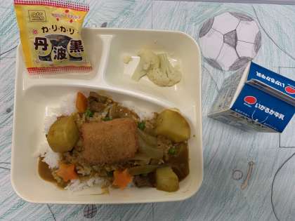 今日の献立は、『カツカレーライス・カリフラワーのピクルス・いり黒豆・牛乳』でした。