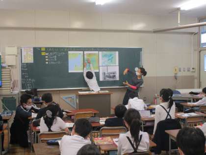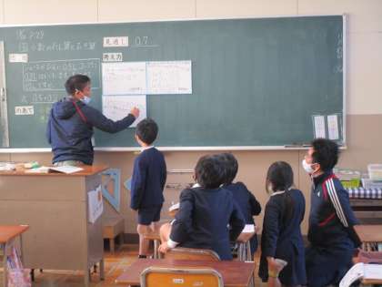 各学年の授業の様子です。3年生は少人数に分けて算数の授業を行っていました。小数の足し算の考え方を発表していました。4年生は社会科の学習でした。資料を見て気づいたことをノートに書き、発表することができていました。