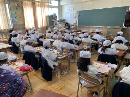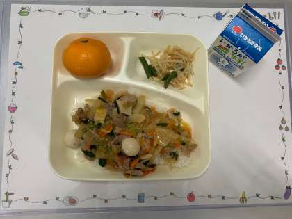 今日の献立は、『中華丼・もやしとさんどまめの中華あえ・みかん・牛乳』でした。