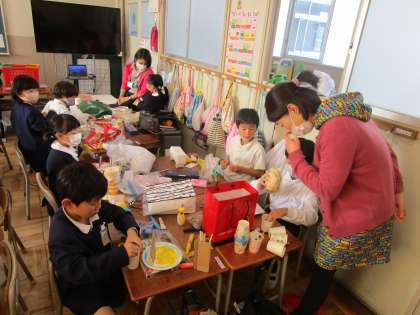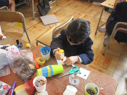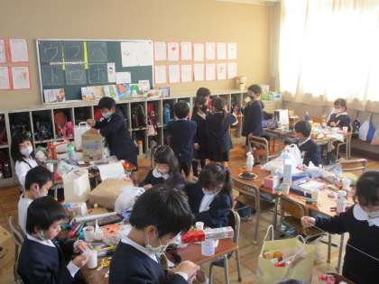 1年生の教室では、生活科の学習に取り組んでいました。校外オリエンテーリングで持ち帰ったドングリや落ち葉などを使って、自分が作りたいものを決め、家から持ってきた材料を使いながら作ることができていました。作ることに大変集中している子どもたちの姿を見ることができました。