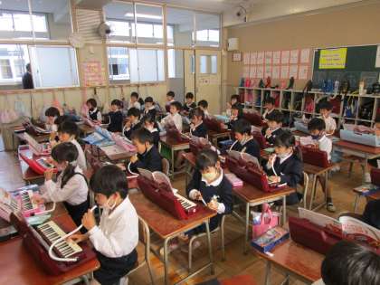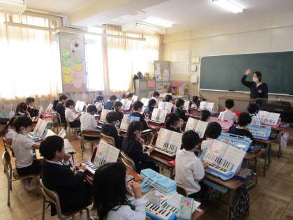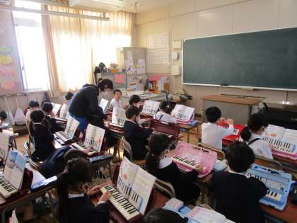 1年生は音楽の時間に鍵盤ハーモニカの指使い、吹き方を学習しました。息の吹き込み方がなかなか難しいです。先生と一緒に練習している姿がありました。