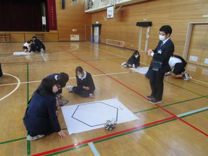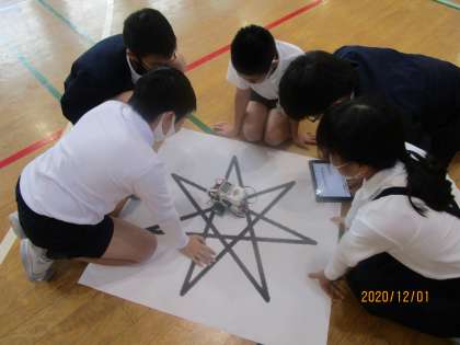 6年生は体育館でプログラミングの学習に取り組みました。グループでロボットを動かすプログラムを考えます。子どもたちはタブレットを見ながら、タイヤの回転数や駆動のバランスを考えてプログラムを考えていました。すごいです。模造紙に描かれた形の上をロボットが進んだときは歓声が上がっていました。ICT支援員さんの来校日ですので学習のサポートをしていただきました。