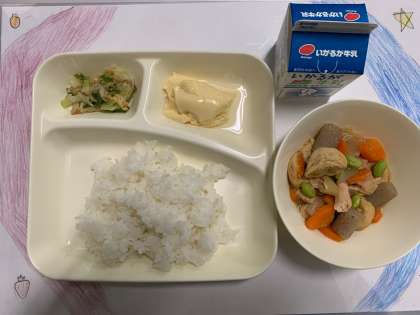 今日の献立は、『卵どうふ・鶏肉と一口がんもの煮もの・野菜のそぼろいため・米飯・牛乳』でした。
