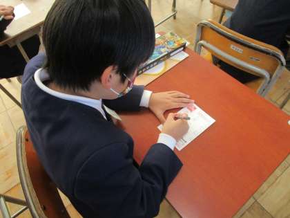 3年生は書写の時間に年賀状を書きました。千林商店街から年賀状を児童に1枚ずつ頂いてますので、活用させていただきました。