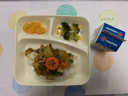 今日の献立は、『冬野菜のカレーライス・ブロッコリーとコーンのサラダ・黄桃(カット缶)・牛乳』でした。