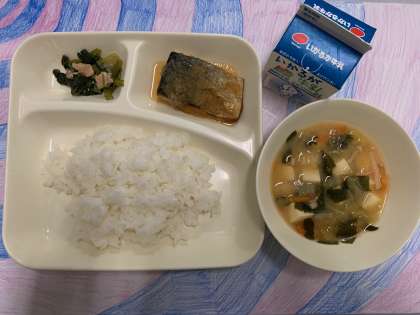 今日の献立は、『さばのみぞれかけ・みそ汁・こまつなの煮びたし・米飯・牛乳』でした。