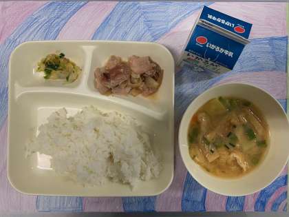 今日は、2学期最後の給食でした。献立は、『豚肉のしょうが焼き・さつまいものみそ汁・きくなとはくさいのごまあえ・米飯・牛乳』でした。