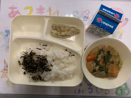 今日の献立は、『いわしてんぷら・あつあげと野菜の煮もの・ごまひじき・米飯・牛乳』でした。