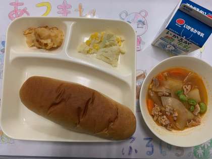 今日の献立は、『豚肉と野菜のケチャップ煮・カリフラワーのピクルス・桃のクラフティ・黒糖パン・牛乳』でした。