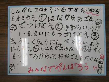 1年生の掲示係の子どもたちが校長室を訪ねてくれました。係で作成した感染症予防のために気を付けることをホワイトボードにまとめ、教室に掲示していると教えてくれました。緊急事態宣言が出たことを担任の先生から聞き、その内容を自分たちでまとめたとのことでした。1年生がきちんとまとめていることに感心し、感染予防の自覚を子どもたち自身がしっかり持ってくれていることに喜びを感じました。子どもたちに学び、私たちも引き続き感染予防に努めなければなりません。