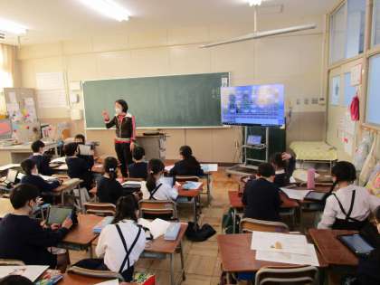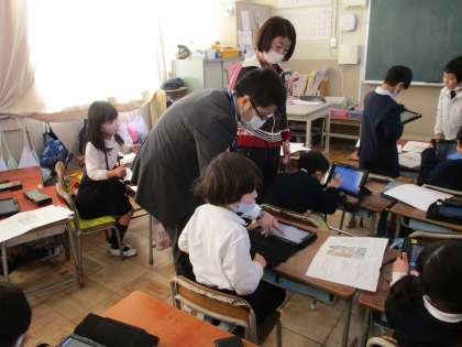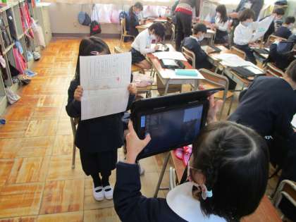 1年生は国語科の学習でタブレットを活用していました。友だちのワークシートを写真にとっていました。今日はICT支援員の方にもサポートしていただくことができました。