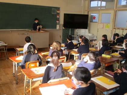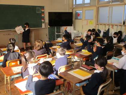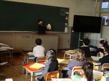 1年生は生活科で取り組んだ「かぞくのにこにこ おたからゲット大さくせん」の発表を行っていました。一人一人がクイズやペープサート、工作物などを用いて友だちに伝えていました。子どもの豊かな発想はとても素敵です。