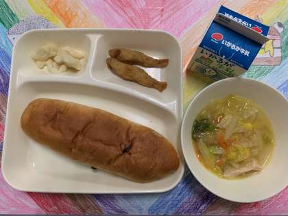 今日の献立は、『わかさぎフライ・はくさいのスープ・カリフラワーのサラダ・レーズンパン・牛乳』でした。