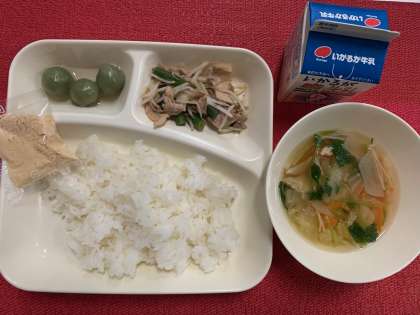 今日の献立は、『豚肉と野菜のいためもの・すまし汁・きな粉よもぎだんご・米飯・牛乳』でした。