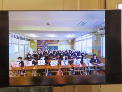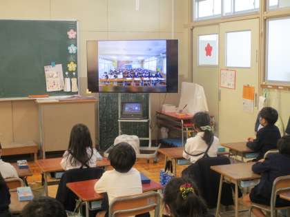 5時間目は卒業お祝い集会を全校で行いました。例年、講堂に全校児童が集まり、6年生の卒業をお祝いするのですが、本年度は一堂に会することができない状況ですのでリモートで行いました。放送で開会のあいさつを行い、その後は各教室で、学級ごとに撮影したお祝いメッセージのビデオをモニターで視聴しました。1年生の子どもたちは、初めての体験で、興味深々にビデオをみていました。