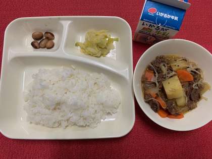 今日の献立は、『肉じゃが・はくさいのゆず風味・とら豆の煮もの・米飯・牛乳』でした。