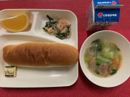 今日の献立は、『えびと野菜のいためもの・中華がゆ・はっさく・コッペパン・バター・牛乳』でした。