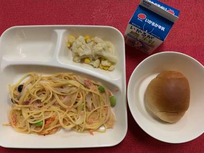 今日の献立は、『さけのクリームスパゲッティ・カリフラワーとコーンのサラダ・黒糖パン・牛乳』でした。