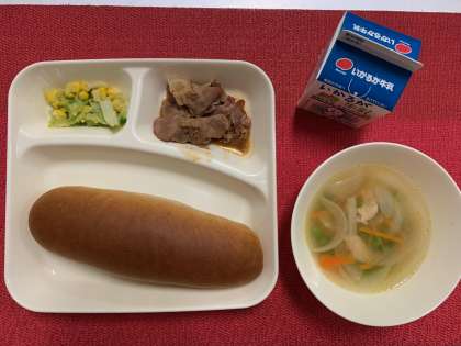 今日の献立は、『豚肉のデミグラスソース・スープ・キャベツとコーンのソテー・黒糖パン・牛乳』でした。