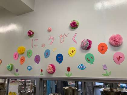 1年生のみなさんにとっては、小学校で初めての給食でした。民間業者の東テスティパルの給食調理員さんも掲示物で入学のお祝いをしてくださいました!