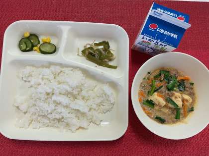 今日の献立は、『マーボーどうふ・きゅうりとコーンの甘酢あえ・もやしとピーマンのごまいため・米飯・牛乳』でした。
