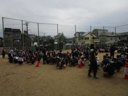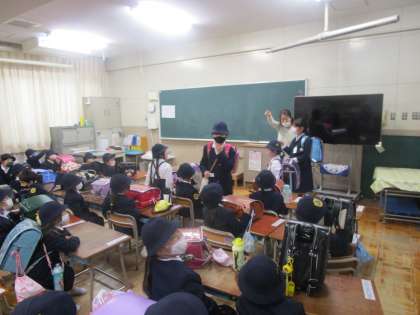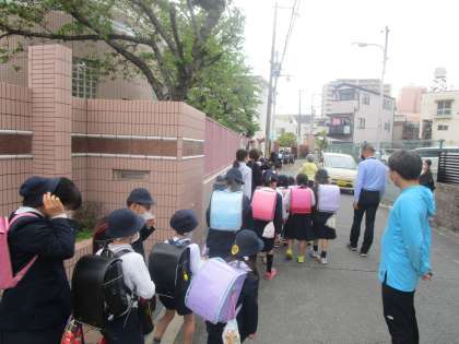 5時間目に地区分団会を行いました。本来は分団ごとに教室で集まりますが、昨年度に引き続き運動場で集まりました。分団担当の先生とあいさつをし、並び方など登下校の注意点などを確認して下校しました。緊急時には分団で下校するときもありますので、集団下校を行いました。