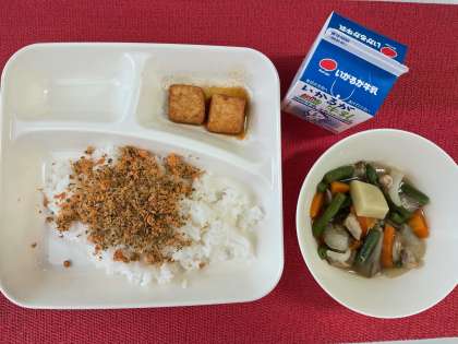 今日の献立は、『鶏肉とじゃがいもの煮もの・あつあげのしょうゆだれかけ・紅ざけそぼろ・米飯・牛乳』でした。