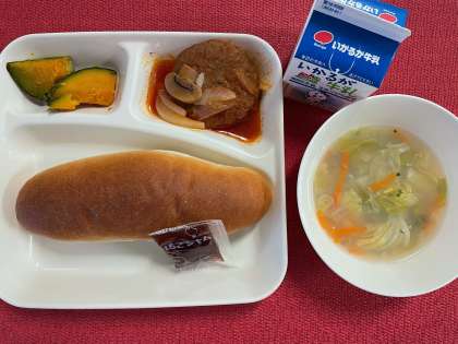 今日の献立は、『煮こみハンバーグ・コーンスープ・焼きかぼちゃ・コッペパン・いちごジャム・牛乳』でした。