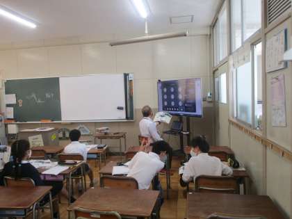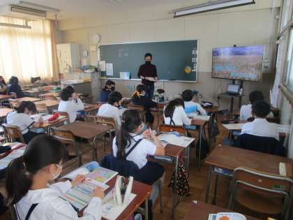 5時間目の5年生の教室の様子です。社会科の学習をオンライン学習で行っていました。動画を画面で視聴し、ワークシートを使ってまとめていました。先生は自宅でオンライン学習に取り組んでいる子どもに質問すると、しっかり答えが返ってきました。自宅で学習している子どもたちも頑張っています。