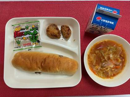 今日の献立は、『一口トンカツ・ミネストローネ・豆こんぶ・レーズンパン・牛乳』でした。