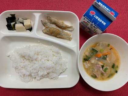 今日の献立は、『きびなごてんぷら・豚汁・わかたけ煮・米飯・牛乳』でした。