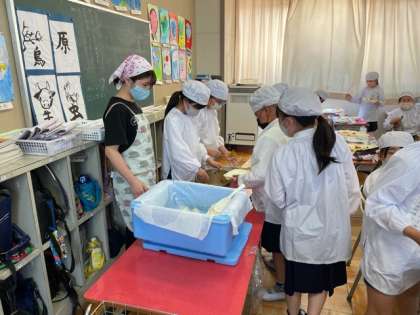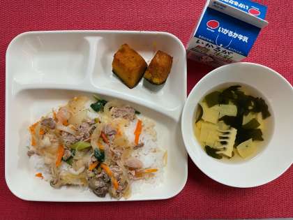 今日の献立は、『豚丼・湯葉のすまし汁・かぼちゃのしょうゆ焼き・米飯・牛乳』でした。